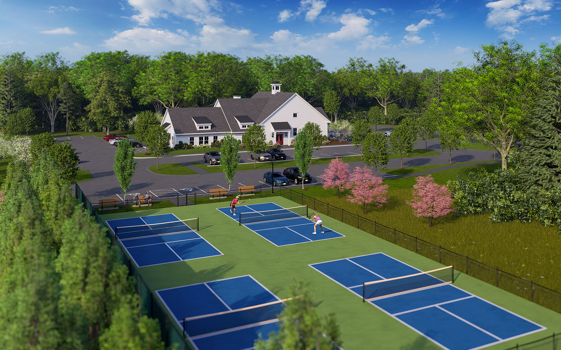 55+ active adult condominium community in Halifax, MA — 102 single-level homes inside elevator-served buildings with no stairs anywhere. Resort-style pool, outdoor kitchen, four pickleball courts, Victory Gardens, dog park, and walking paths. Adjacent to the Country Club of Halifax's 18-hole golf course and a town-operated senior center on site. Thorndike's sixth 55+ community — more than any other South Shore builder. Sales center open daily 11–4.